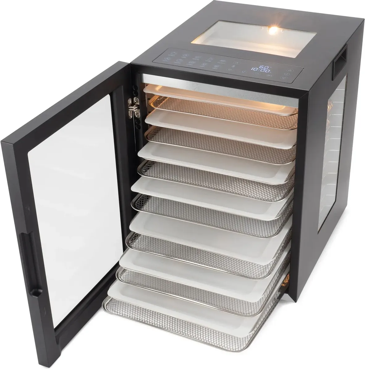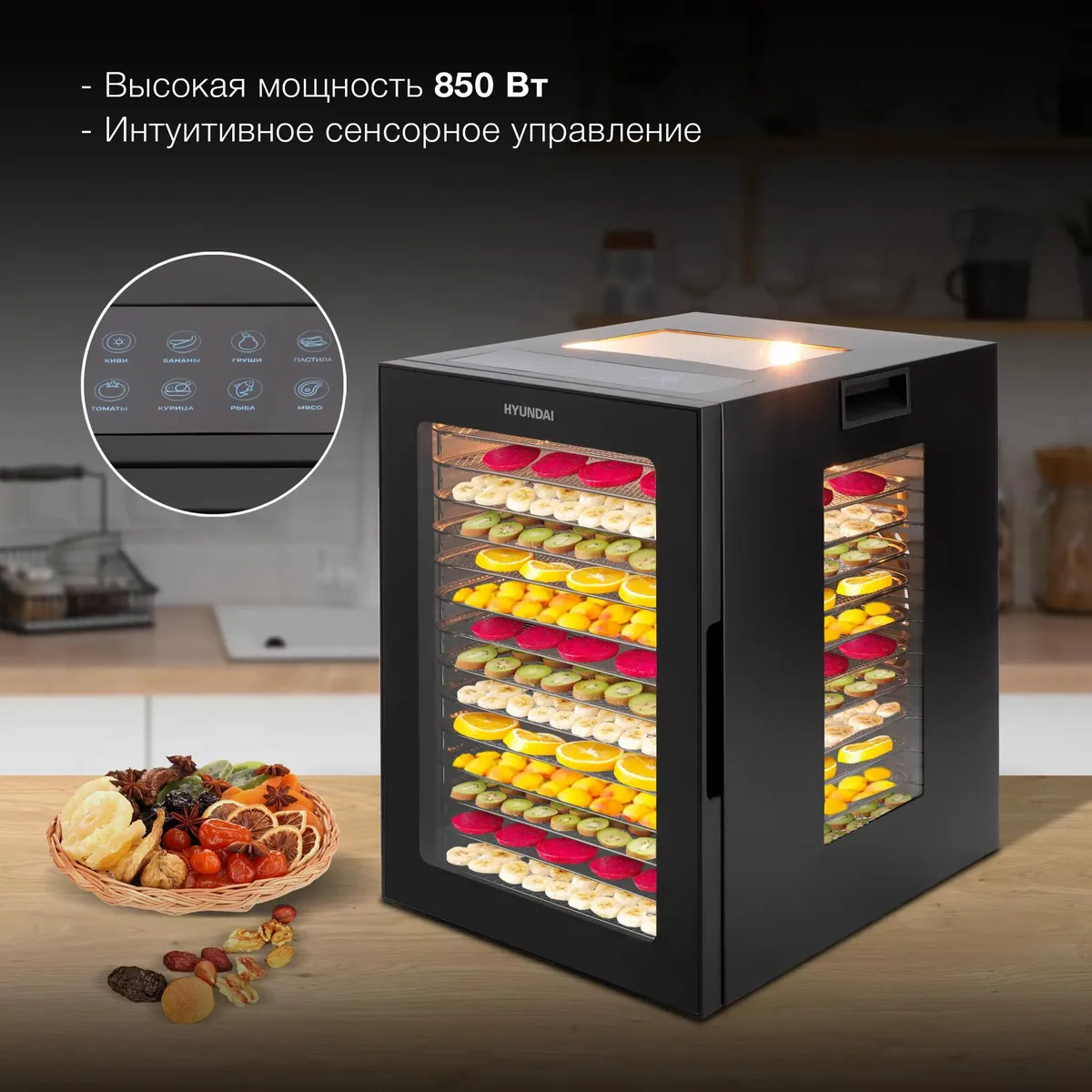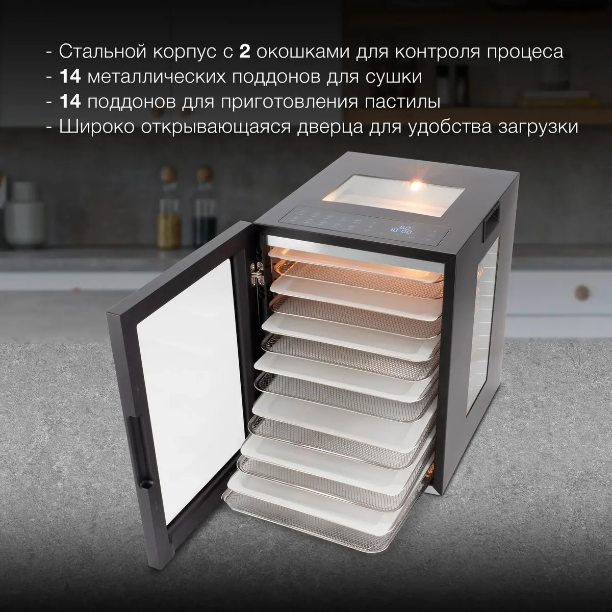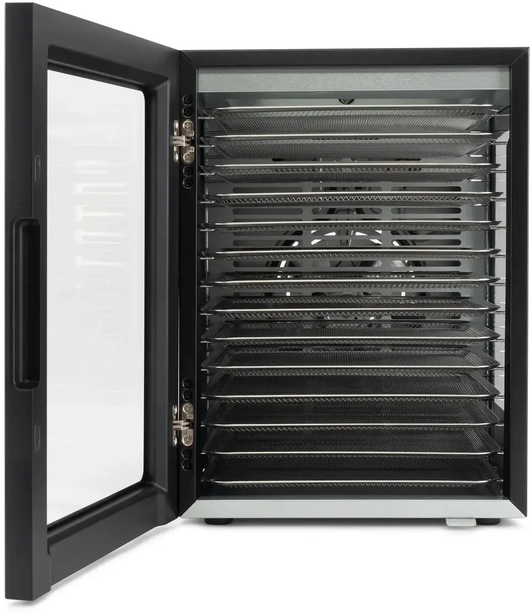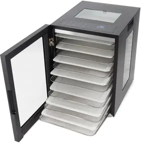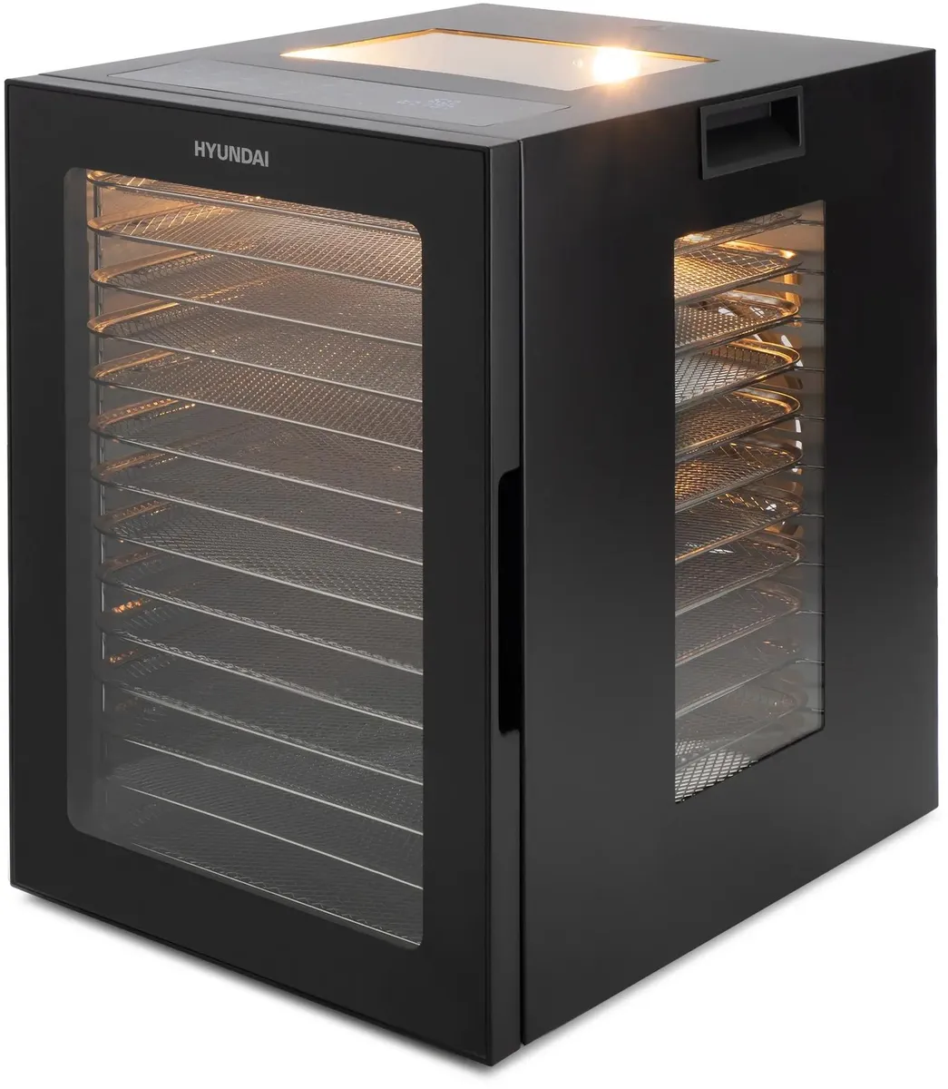 Вместительная и стильная сушильная камера в металлическом корпусе, с регулировкой температуры и таймером, для сушения овощей и фруктов, грибов и трав, а так же вяленья мяса и рыбы. Весь необходимый функционал, в удобном форм-факторе с сенсорным управлением.