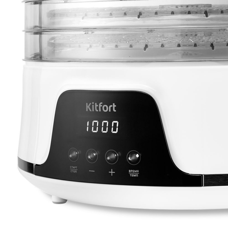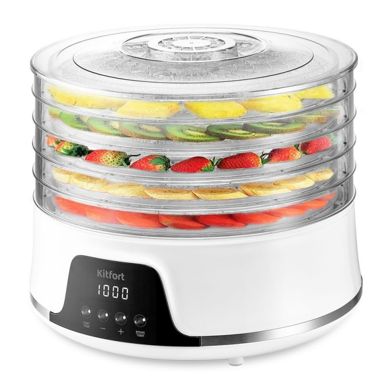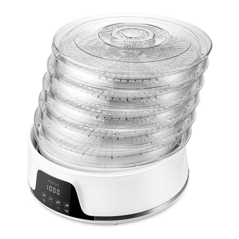 Сушилка Kitfort KT-1944 имеет в комплекте 5 поддонов из прозрачного пластика, так вы сможете наблюдать за процессом сушки. Пластик BRA-free не содержит Бисфенол А, а значит — полностью безопасный для здоровья.