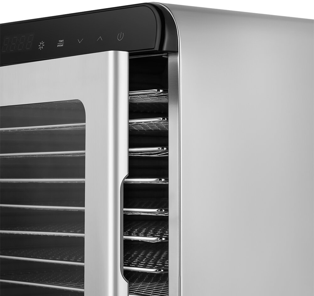 В сушилке установлен мощный нагревательный элемент и вентилятор большого диаметра, обеспечивающий равномерное распределение нагретого воздуха по всему объему камеры. Благодаря горизонтальному обдуву смешение запахов при сушке разных продуктов минимально.