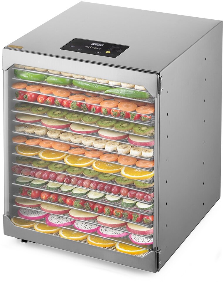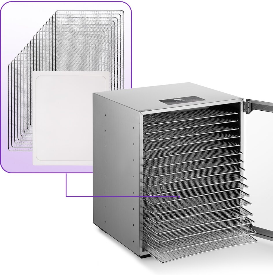 16 металлических поддонов подходят для большинства продуктов. Поддон для жидкости служит для сушки водянистых продуктов, чтобы они не прилипали к металлу. Также можно класть этот поддон на низ сушилки, чтобы сок и остатки от продуктов падали на него.