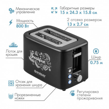 Дополнительные функции: регулировка степени обжаривания, кнопка отмены, автоматическое центрирование тостов, автоматическое поднятие тостов