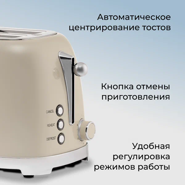 автоматическое поднятие тостов, автоматическое центрирование тостов, кнопка отмены, регулировка степени обжаривания