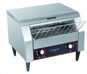 Конвейерный тостер GASTRORAG TT-EST-A-2 - это профессиональное кухонное оборудование высокой производительности (до 240 тостов в час), предназначенное для крупных предприятий фаст фуд, где посетители потребляют большое количество поджаренного хлеба и булочек. Электрический тостер имеет три режима работы: обжарка тостов (верхний и нижний нагрев), обжарка половинок булочек (только верхний нагрев) и режим ожидания для экономии электроэнергии во время простоя оборудования. Ширина конвейера 285 мм, высота рабочей зоны 80 мм, что позволяет обжаривать практически любые виды хлеба и булочек. Степень обжарки задается путем регулировки скорости движения конвейера. Хлеб загружается на решетку в передней части тостера и выходит на лоток в задней части. Предусмотрен также поддон для сбора крошек.