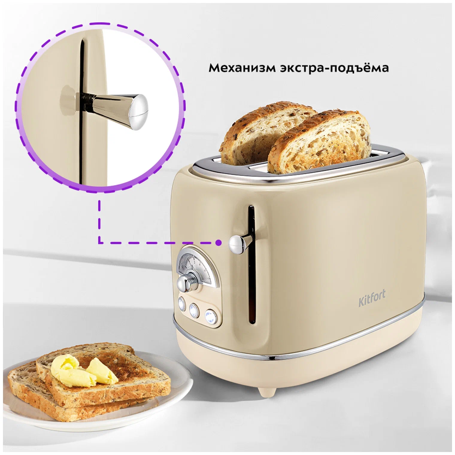 Дополнительные функции: регулировка степени обжаривания, кнопка отмены, автоматическое центрирование тостов
