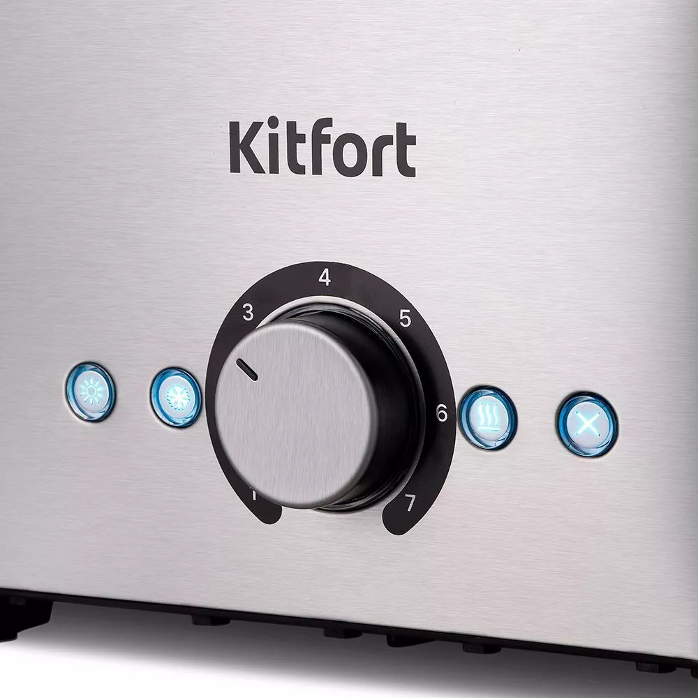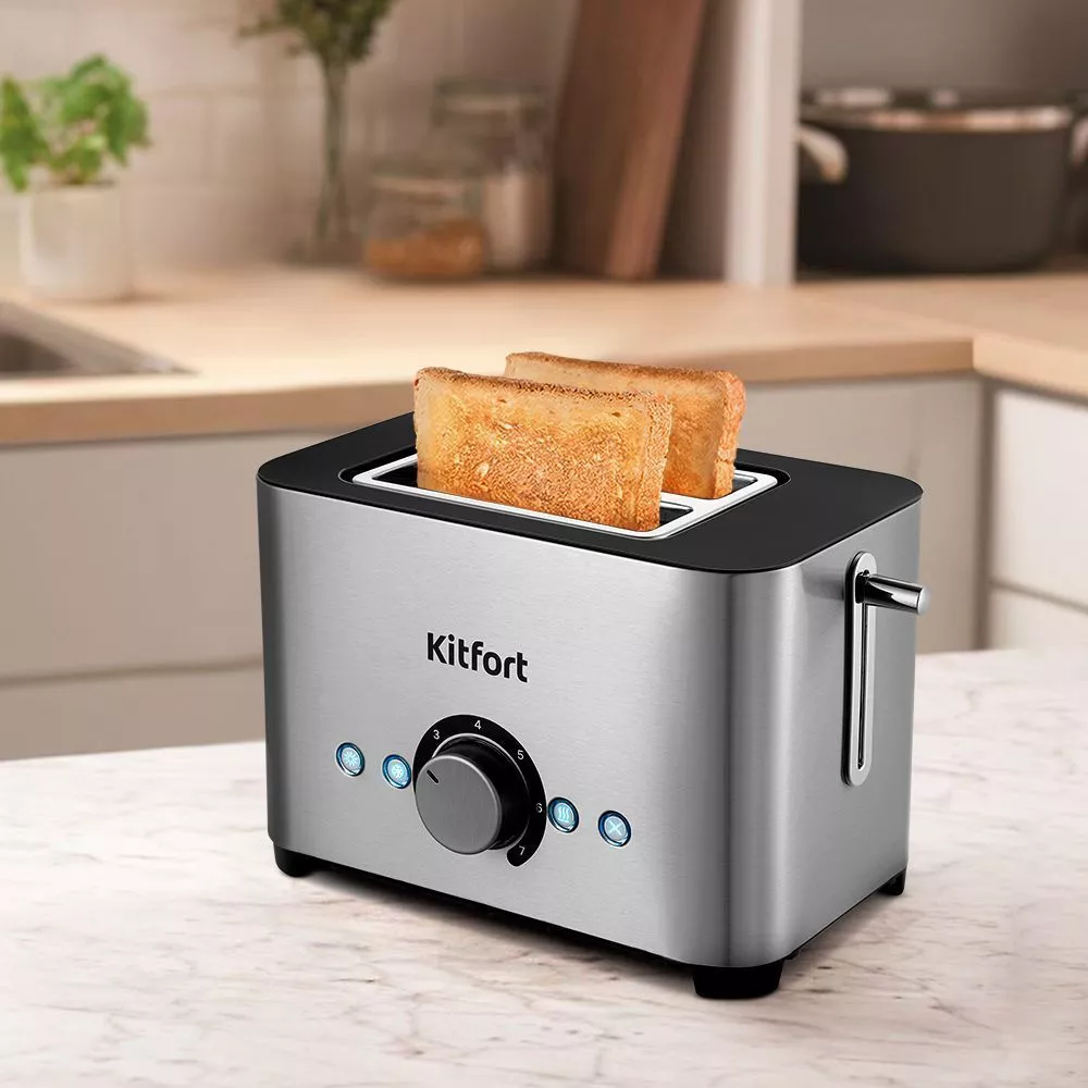 Тостер имеет 7 степеней обжарки, которые можно настраивать регулятором. Кнопка «подогрев» поможет разогреть тост до необходимого состояния. Благодаря кнопке «разморозка» можно легко подогреть замороженные кусочки хлеба без потери его вкусовых качеств.
