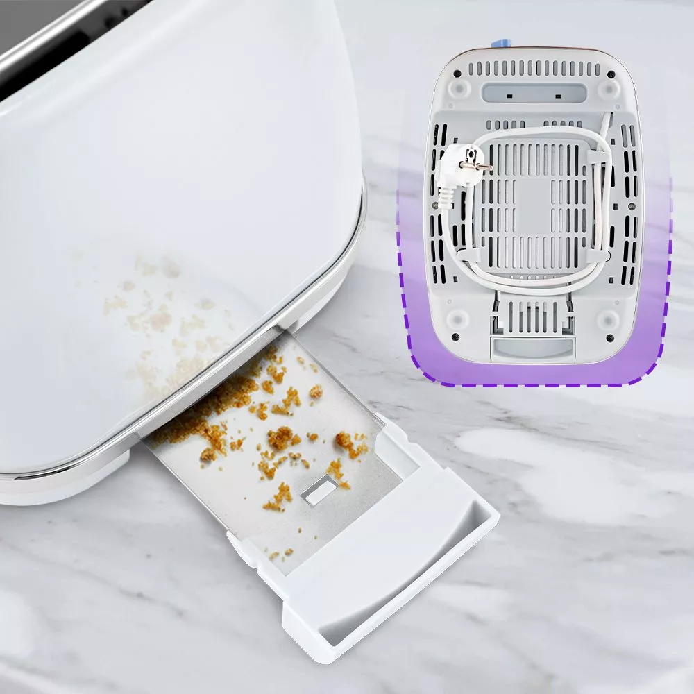 В нижней части корпуса тостера расположен выдвижной поддон для крошек, поэтому чистить тостер просто и удобно. На дне корпуса тостера имеется отсек для хранения шнура, в который можно смотать излишки шнура электропитания, чтобы он не мешал на столе.