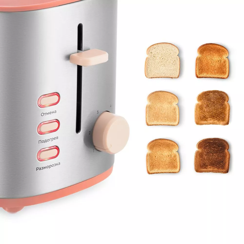 Тостер оснащён поворотным регулятором степени обжаривания и тремя кнопками. Режим подогрева служит для подогрева уже готовых тостов, если они остыли. Режим разморозки позволяет приготовить тосты из замороженного хлеба.