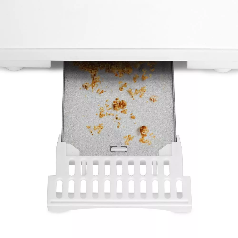Съёмный поддон для крошек позволяет легко и удобно очистить тостер от хлебных крошек. Чтобы достать поддон из нижней части корпуса устройства, необходимо потянуть его на себя, а затем вытряхнуть из поддона все крошки.