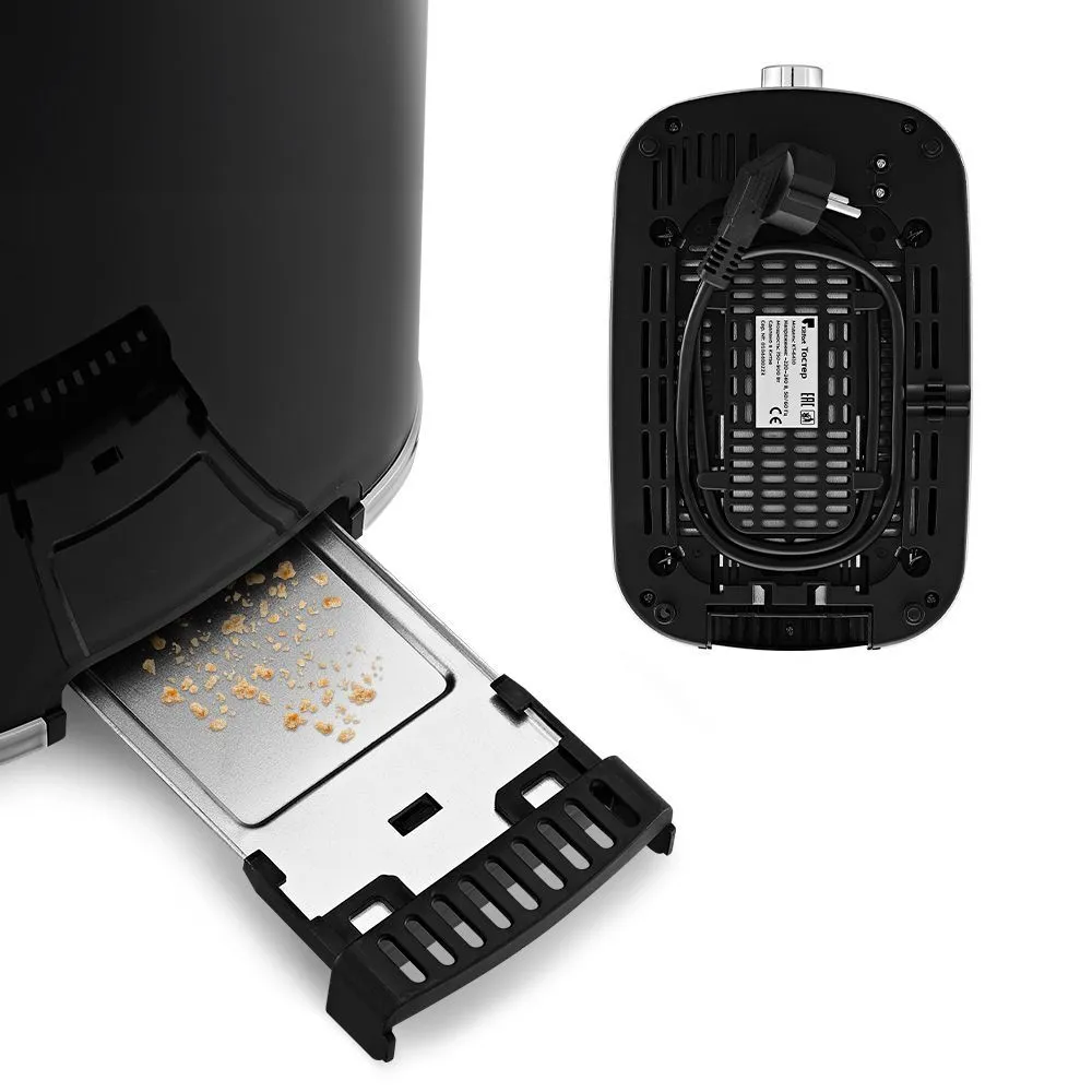 В нижней части корпуса тостера расположен выдвижной поддон для крошек, поэтому чистить тостер просто и удобно. А также снизу у тостера есть удобный отсек для хранения шнура. Длина шнура – 0,7 м.