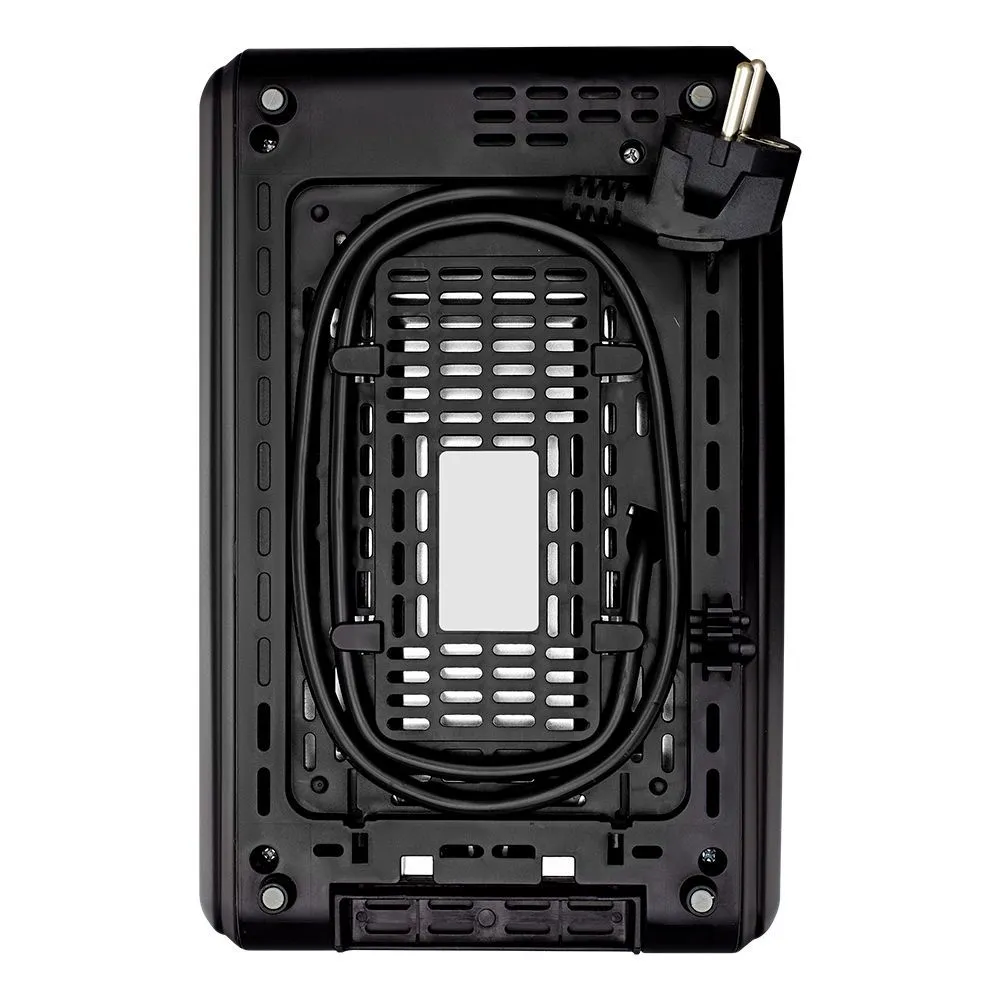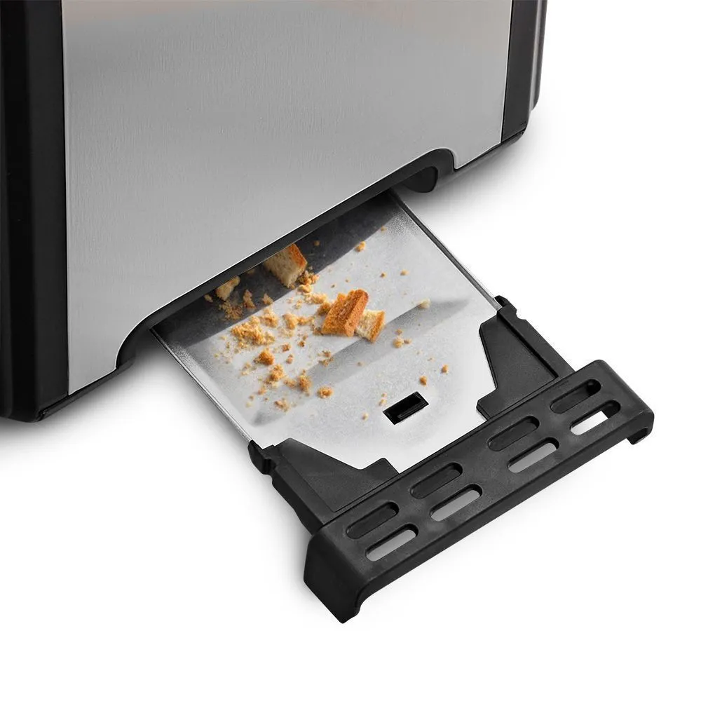 В нижней части корпуса тостера расположен съёмный поддон для сбора крошек. Просто выдвиньте его и выбросите скопившиеся крошки, а остатки протрите салфеткой.