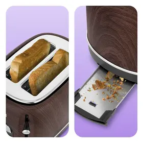 Тостер имеет широкие слоты и подходит не только для ломтиков хлеба, но и для других хлебобулочных изделий. В нижней части корпуса расположен съёмный поддон для крошек. Просто выдвиньте его и выбросите скопившиеся крошки, а остатки протрите салфеткой.