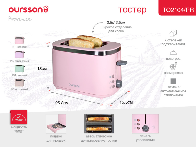 Современный компактный тостер TO2104 OURSSON из ограниченной линейки цветов для бытовой кухонной техники в стиле «Прованс» мощностью 750 Вт, рассчитанный на 2 ломтика хлеба порадует вас аппетитными с хрустящей корочкой тостами. Прибор имеет 7 степеней обжаривания, а также функции размораживания и подогрева. Тосты будут расположены точно по центру благодаря автоматическому центрированию. Остановить приготовление можно в любое время с помощью кнопки Отмена. Поддон для крошек облегчает уход и поддержание чистоты.