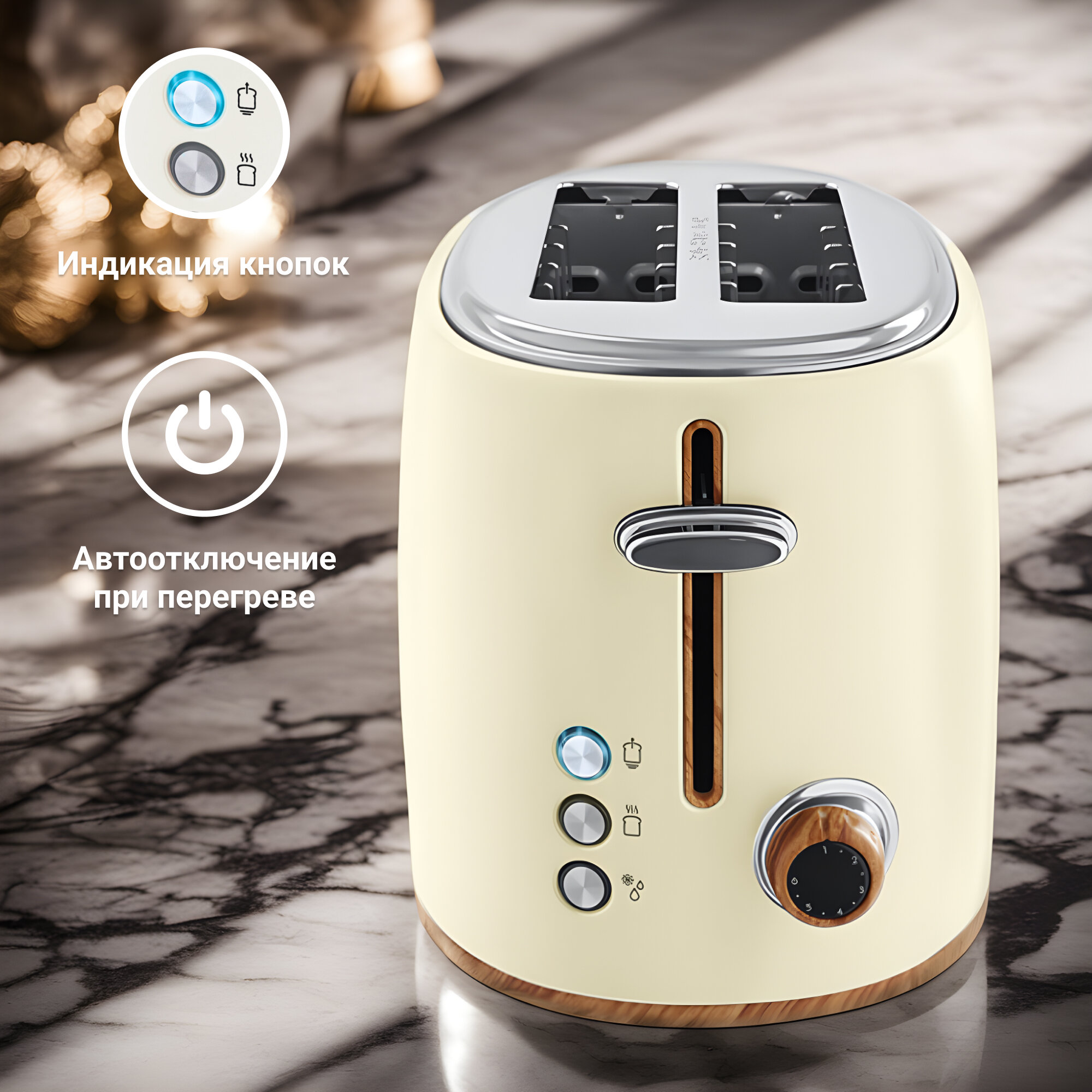автоматическое поднятие тостов, автоматическое центрирование тостов, кнопка отмены, регулировка степени обжаривания