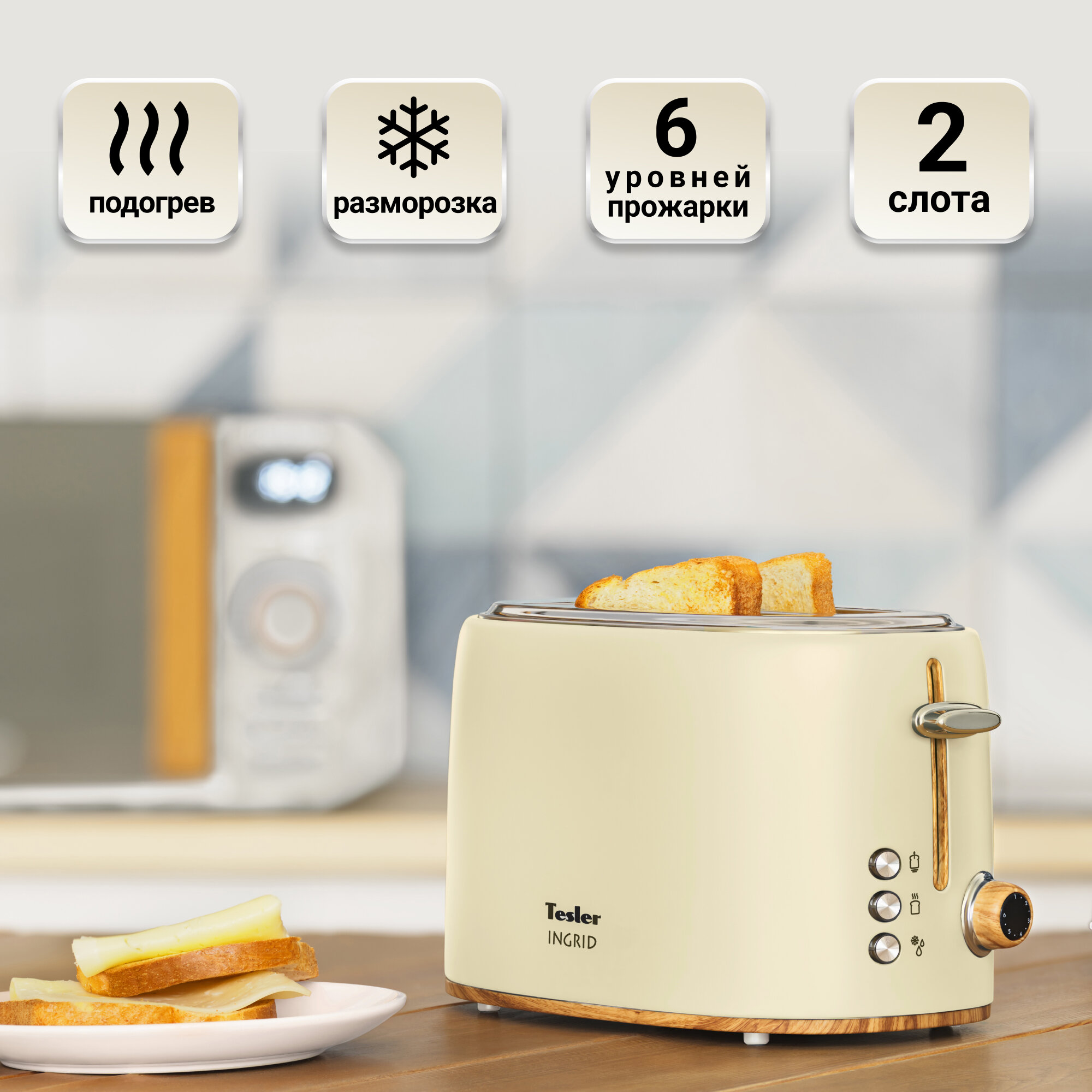 Тостер Tesler TT-240 из линейки кухонных приборов INGRID поможет приготовить идеальные тосты. Обладая мощностью 900 Вт, тостер TT-240 быстро разогреет, поджарит или разморозит ломтики хлеба. Устройство оснащено двумя отсеками для хлеба, поэтому процесс приготовления не займет много времени. Выберите один из 6 доступных уровней прожарки и опустите рычаг – всё остальное TESLER TT-240 сделает сам.