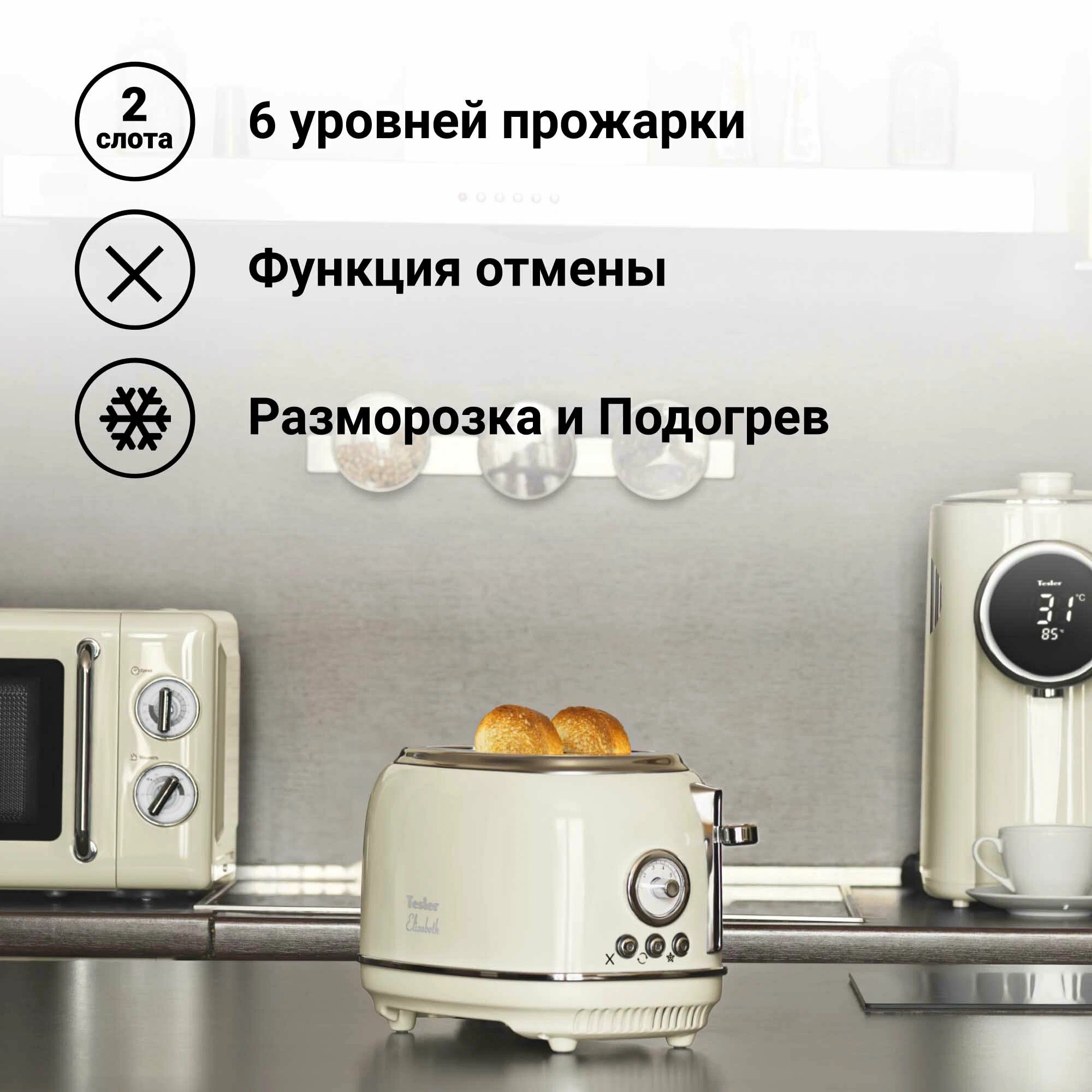 автоматическое поднятие тостов, лоток для крошек, нескользящие ножки, разморозка, регулировка температуры, функция подогрева