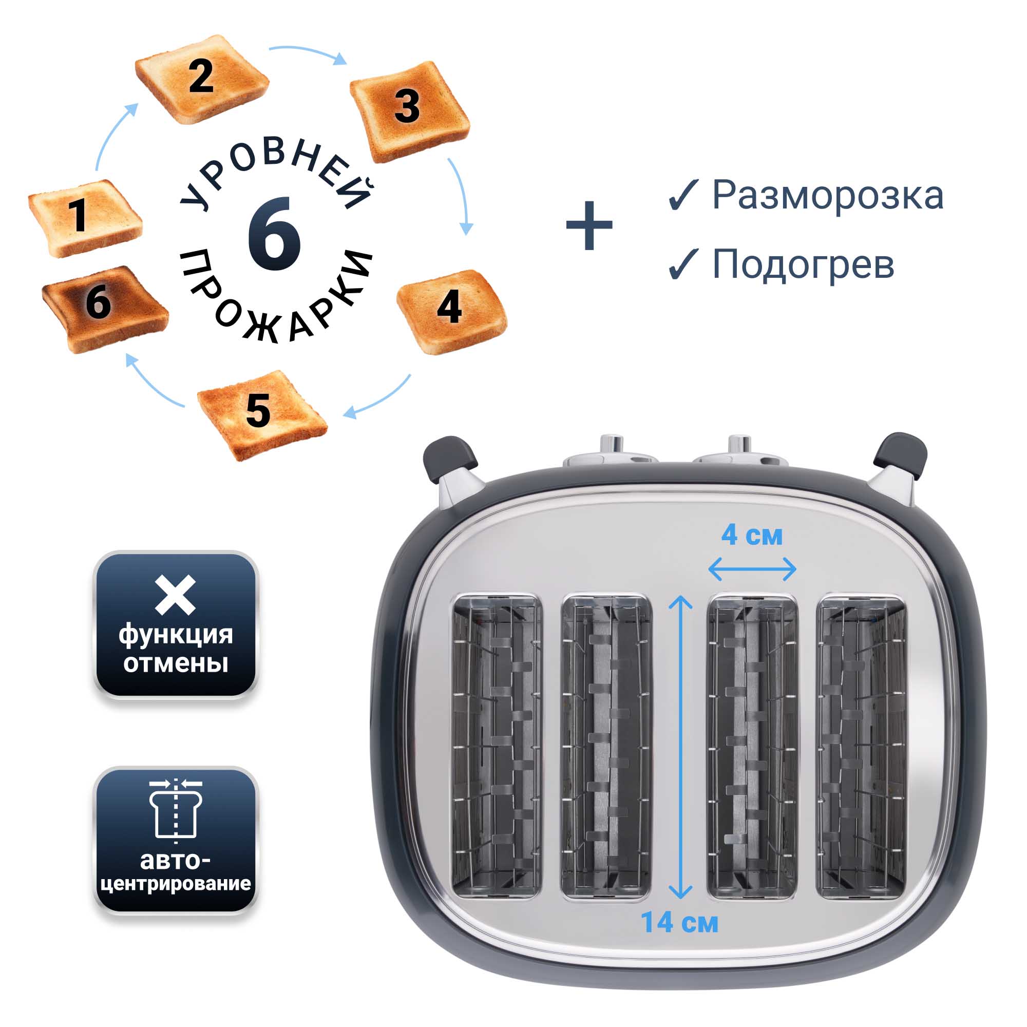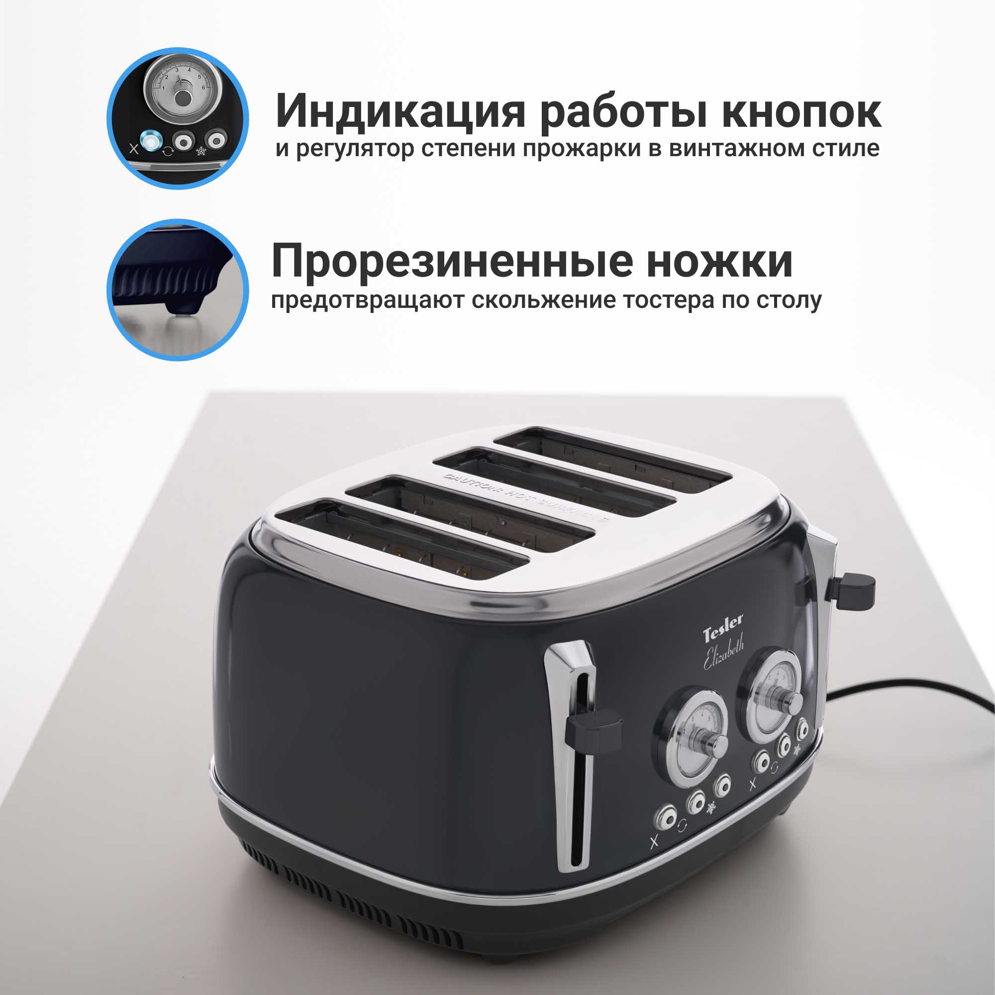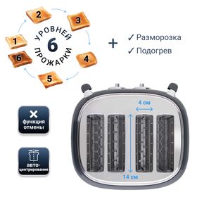 В случае перегрева тостер автоматически отключится, что защитит его от преждевременной поломки.