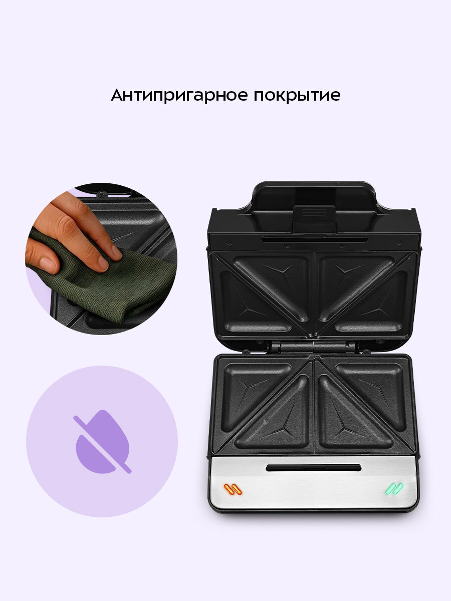 Антипригарное покрытие панелей равномерно распределяет тепло, позволяя готовить с минимальным количеством маслом. Это снижает калорийность и сохраняет полезные свойства пищи, а также упрощает чистку, так как остатки не пригорают.
