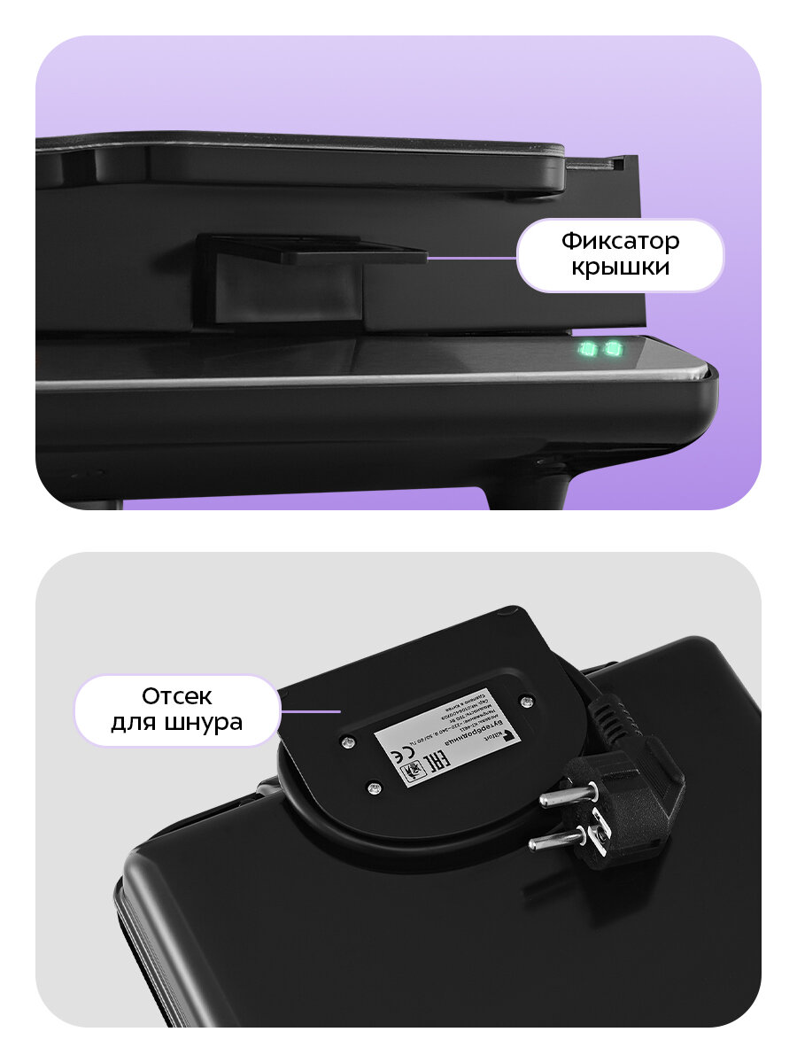 В нижней части корпуса предусмотрен отсек для шнура питания, который обеспечивает удобное размещение и защиту кабеля. Надёжный фиксатор крышки гарантирует её надёжное закрытие, что упрощает готовку, транспортировку и хранение.
