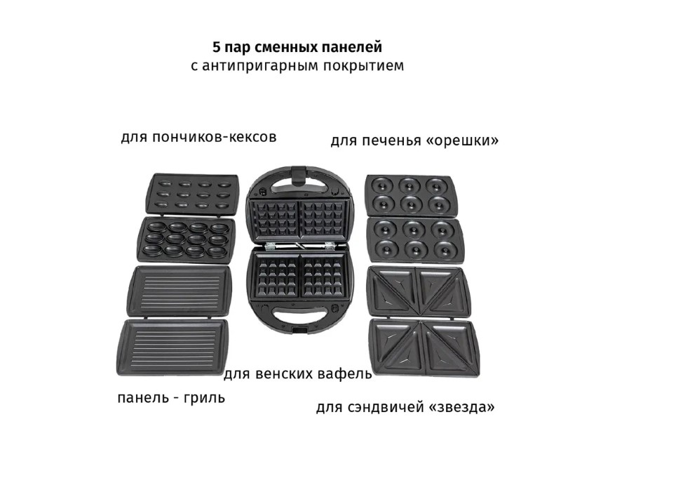 Современный прибор для выпечки Pioneer SM520D 5 в 1 с антипригарным покрытием, 5 сменными панелями - идеальное решение для приготовления различных блюд на гриле, а также венских вафель, сэндвичей, пончиков-кексов и печенья «орешки» в домашних условиях.