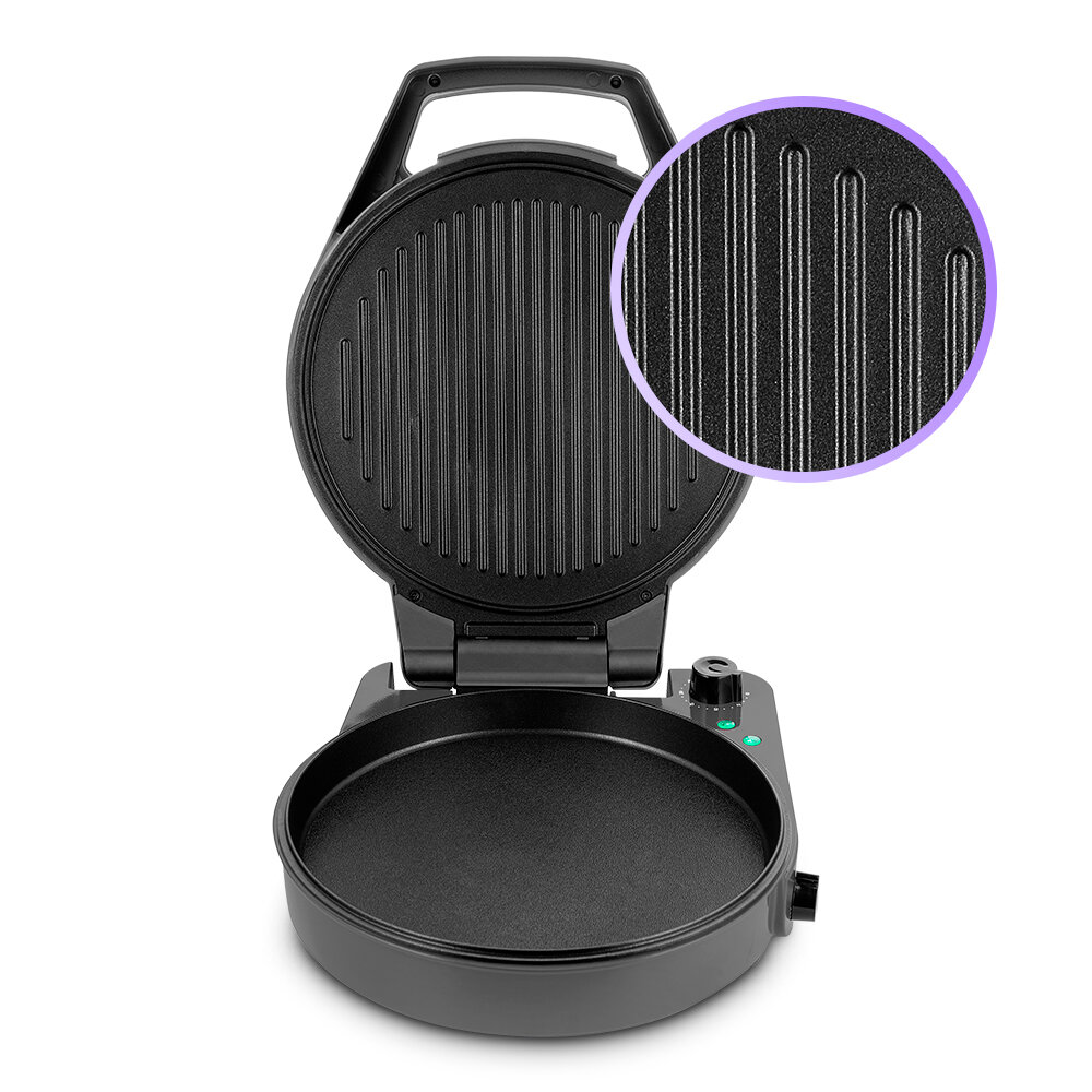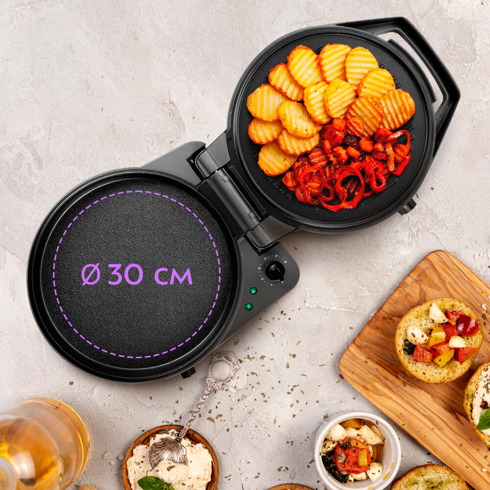 Прорезиненные ножки не дают прибору скользить по столу во время готовки. Диаметр панелей 30 см и мощность 1800 Вт.
