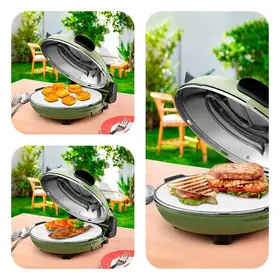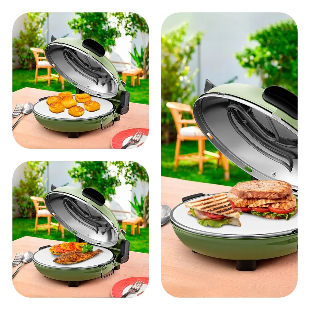 Пиццамейкер оснащён регулятором температуры и таймером, индикаторами питания и нагрева. Нагревательные элементы расположены в корпусе и крышке прибора. Всего у пиццамейкера 5 уровней нагрева и таймер до 15 минут.