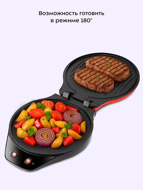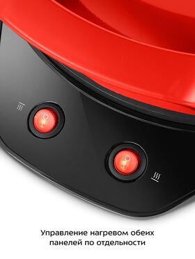 Конструкция пиццамейкера позволяет готовить в одностороннем режиме. Верхняя панель может откидываться на 180°. В данном режиме пиццамейкер превращается в большую жаровню — для приготовления можно использовать обе панели.