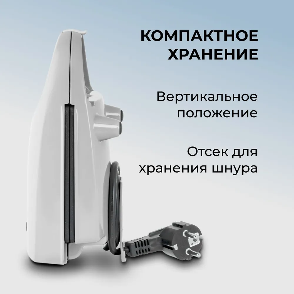 Конструктивные особенности тепловых приборов: Антипригарное покрытие, Вертикальное хранение, Отсек для хранения шнура, Ручка для переноски