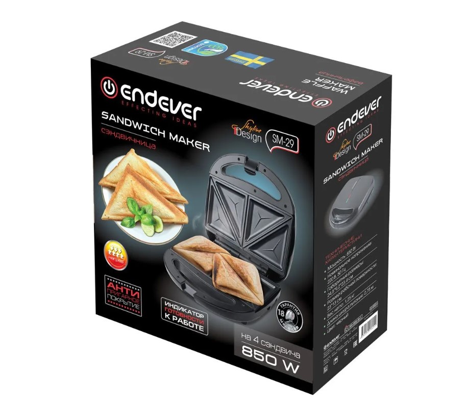 Благодаря электрической сэндвичнице Endever Skyline SM-29, Вы сможете приготовить настоящие английские сэндвичи со всевозможными начинками. Во время приготовления они разделяются на красивые треугольные кусочки. А высокая мощность 850 Вт позволит приготовить сэндвичи еще быстрее.