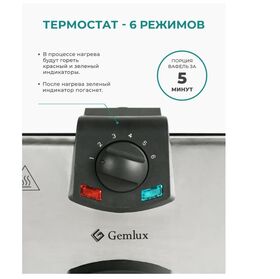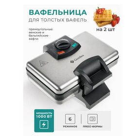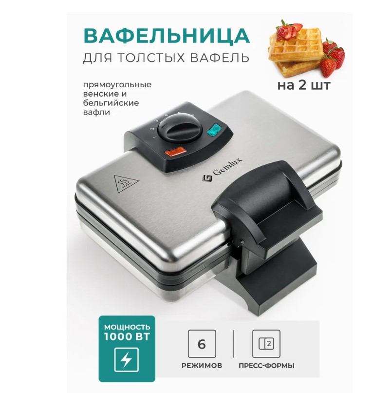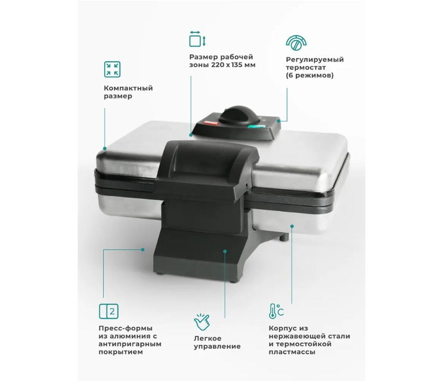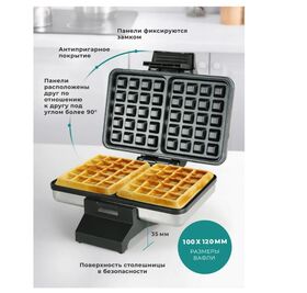 Электрическая вафельница Gemlux GL-WM849 - это компактная бытовая техника для кухни и приготовления блюд, предназначенная для выпечки прямоугольных венских и бельгийских вафель. Электровафельница оснащена двумя несъемными панелями размером 22х13.5 см из алюминия с антипригарным тефлоновым покрытием, которые прогреваются до рабочей температуры 150-200оС за 3-5 минут. За один цикл выпечки вы получаете две толстые вафли размером 10х12х2 см. Регулируемый термостат позволяет добиться нужного цвета корочки. Мощные нагревательные элементы обеспечивают быструю работу мини вафельницы: обычные бисквитные и дрожжевые вафли выпекаются при максимальном нагреве за 5-6 минут, вафли с добавлением тертого сырого картофеля - за 12-13 минут. Корпус электро вафельницы изготовлен из нержавеющей стали с элементами черного пластика. Накидная защелка надежно фиксирует панели в закрытом состоянии. Резиновые накладки на ножки противодействуют скольжению и обеспечивают безопасность в работе.