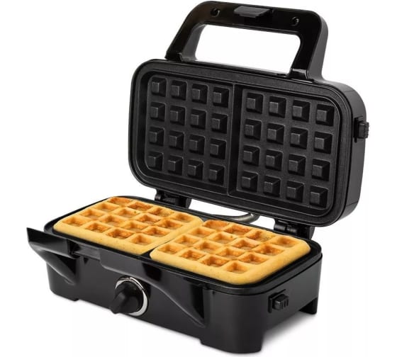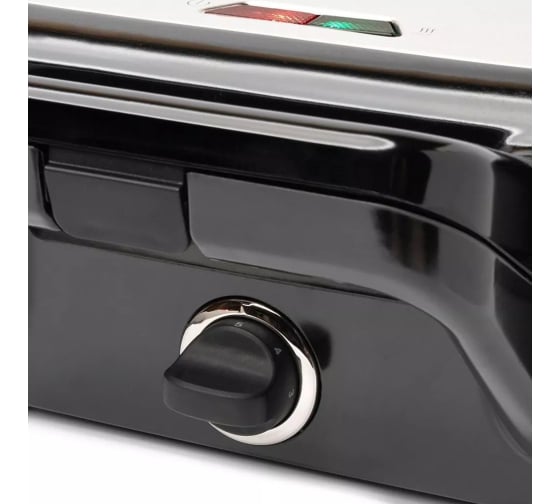 Антипригарное покрытие не позволяет блюдам прилипнуть к панелям. Регулятор температуры, расположенный на корпусе вафельницы, позволяет установить нужную интенсивность нагрева панелей.