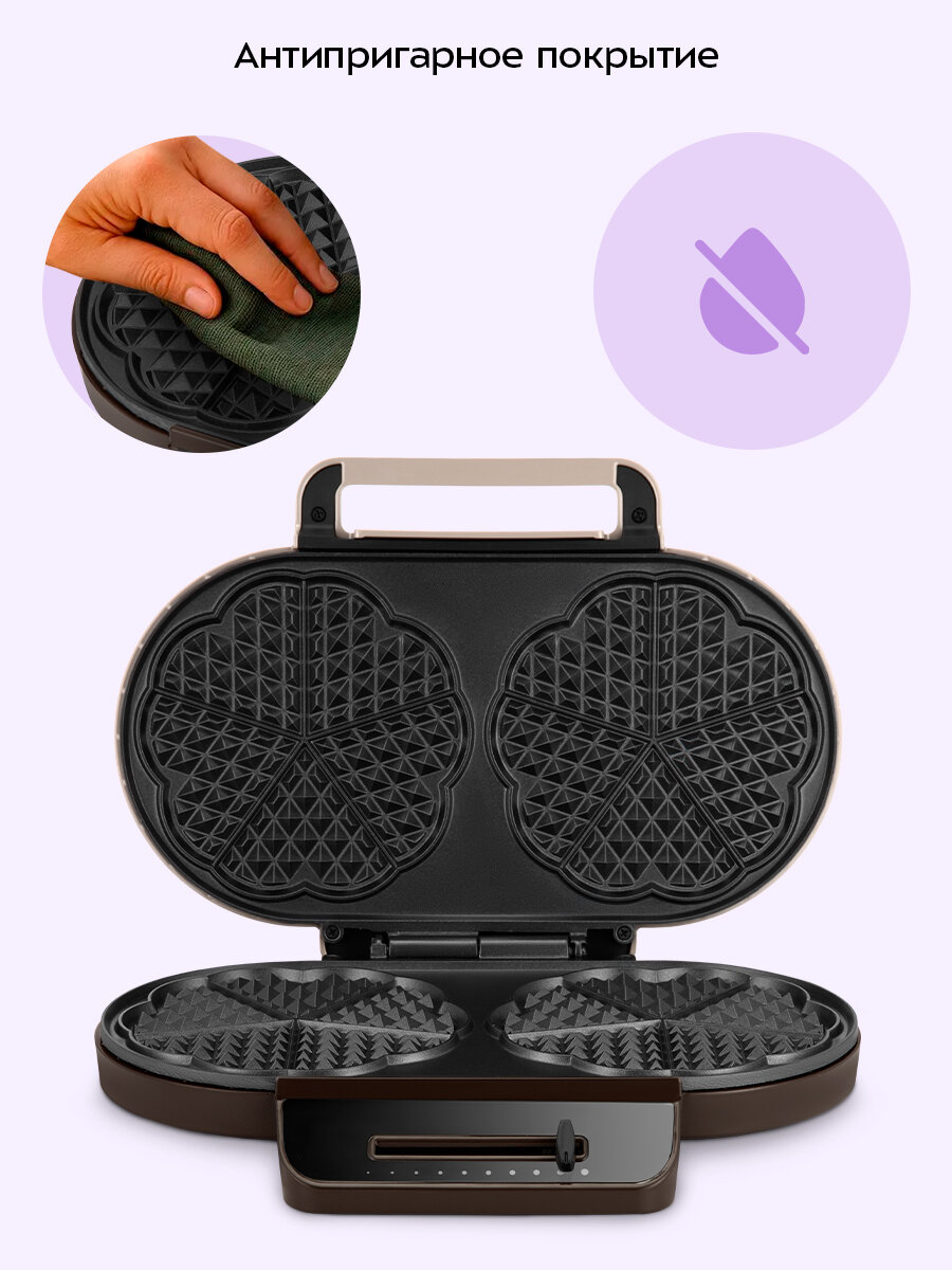Благодаря антипригарному покрытию тесто не прилипает к панелям, что упрощает процесс приготовления и позволяет делать идеальные вафли без лишних усилий. Также антипригарное покрытие позволяет готовить без масла и облегчает чистку панелей.