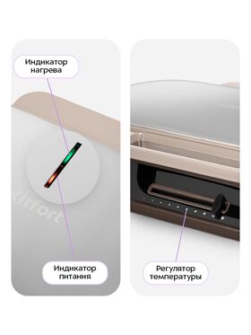 Индикатор работы горит, когда прибор включён в сеть, а индикатор нагрева покажет, когда панели разогреются. Термостат регулирует температуру и поддерживает её в процессе приготовления. Он позволяет изменять температуру от 140±10°С до 200±10°С.