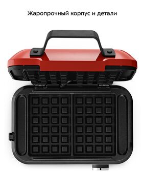 Электрическая вафельница имеет корпус, выполненный из прочного термоустойчивого пластика. В вафельнице установлены нагреватели в каждой половине. Прорезиненные ножки не дают прибору скользить по столу во время готовки.