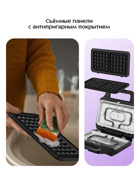 Для удобства ухода панели сделаны съёмными — их можно мыть под проточной водой. На панели нанесено антипригарное покрытие, что позволяет готовить с минимальным количеством масла. Такое покрытие также облегчает процесс чистки панелей.