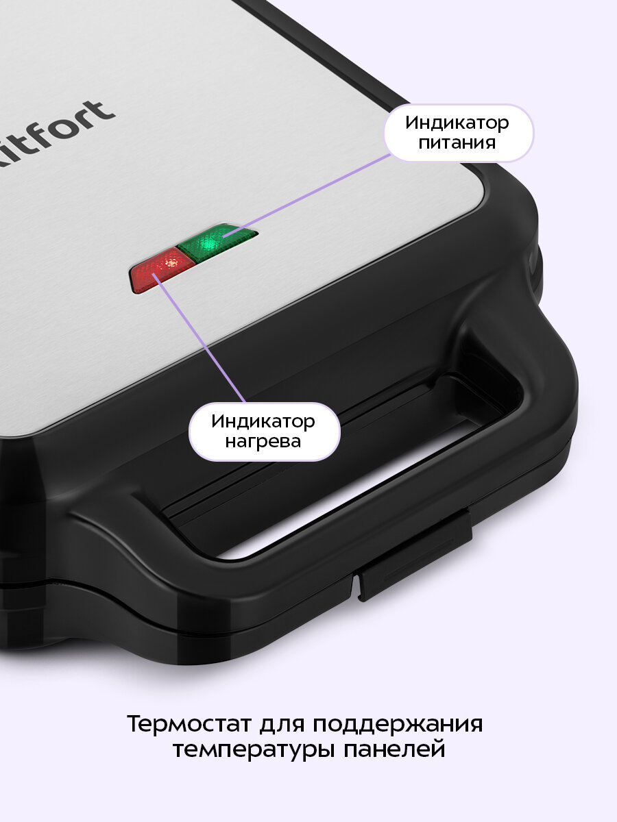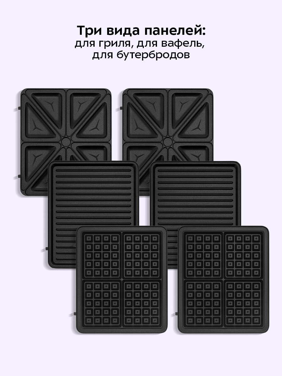 В набор входят три съёмные пары панелей: панели для приготовления вафель, панели для приготовления бутербродов и ребристые панели для гриля. Высокая температура нагрева панелей способствует быстрому приготовлению продуктов.