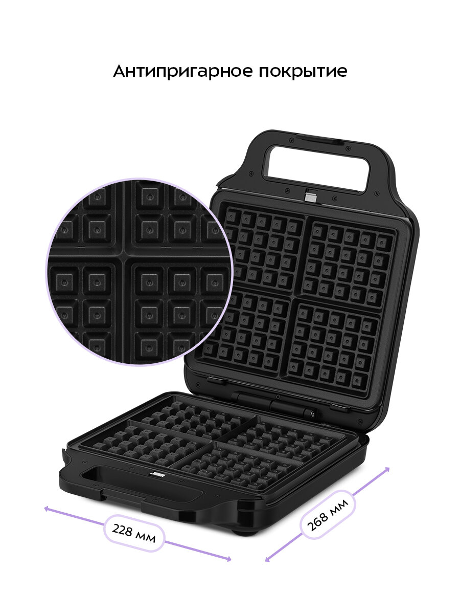 Панели имеют антипригарное покрытие, что позволяет легко и просто готовить любимый десерт. Благодаря такому покрытию готовить вафли можно с минимальным количеством масла или без него.
