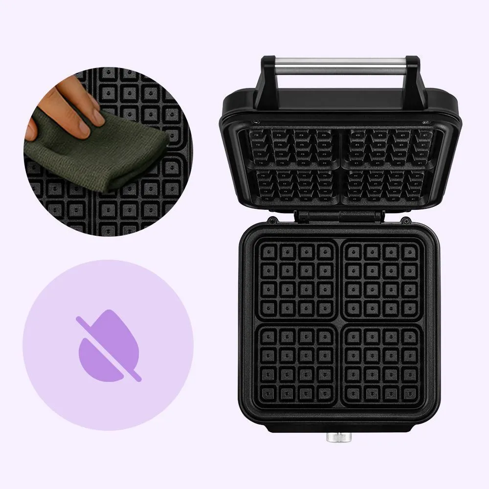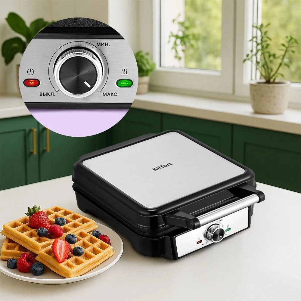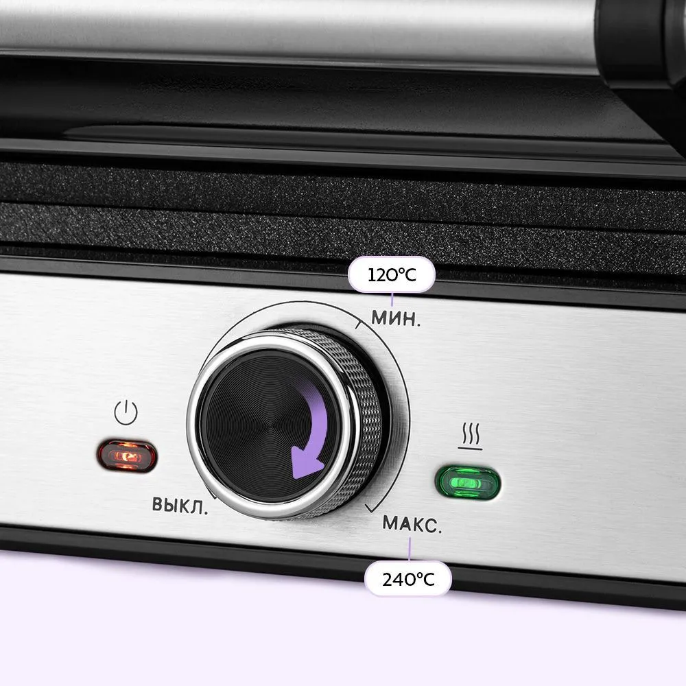 Модель оснащена терморегулятором для точной настройки температуры при приготовлении вафель (от 120 °С до 230 °С). Для включения нагрева достаточно повернуть регулятор по часовой стрелке от минимальной до максимальной температуры