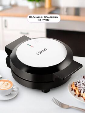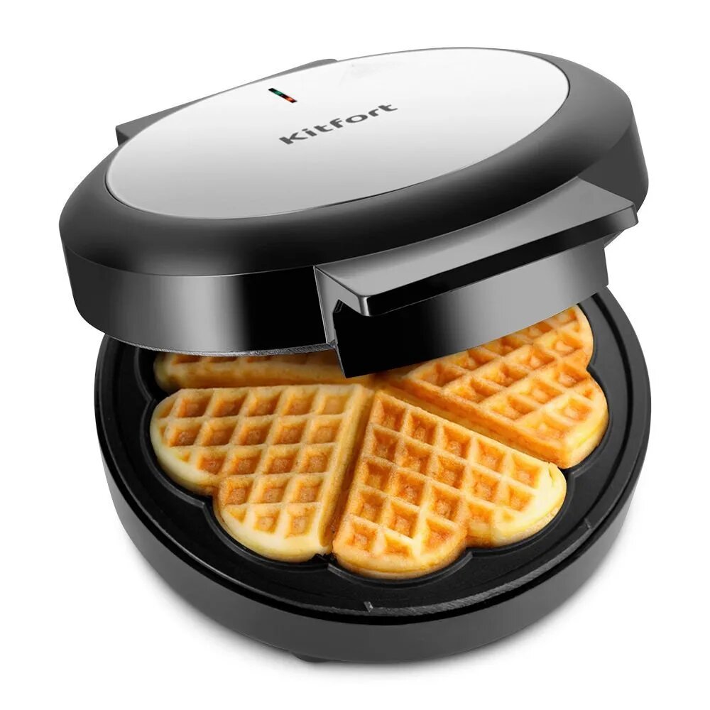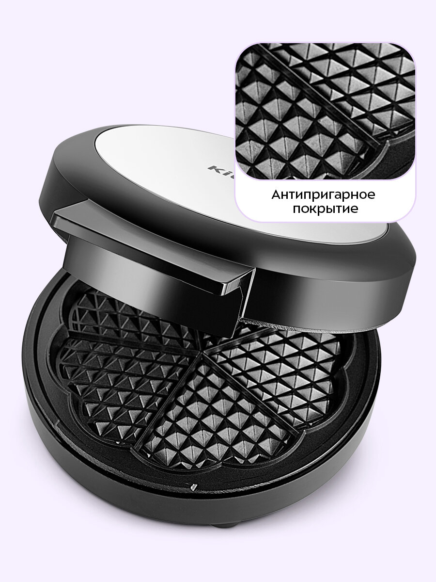 Вафельница КТ-5609 мощностью 1000 Вт имеет прочный пластиковый корпус с противоскользящими ножками. Корпус и крышка сильно нагреваются, возможен выход пара. Открывайте и закрывайте крышку только за ручку во избежание ожогов.