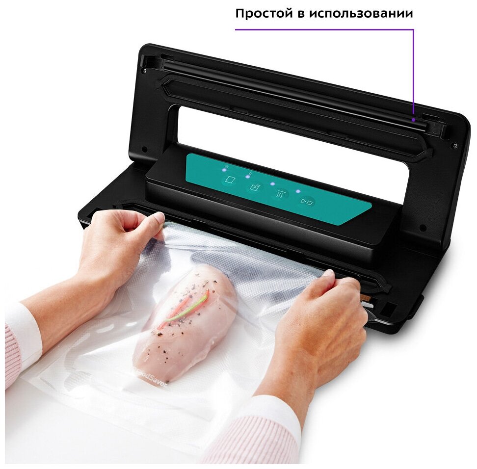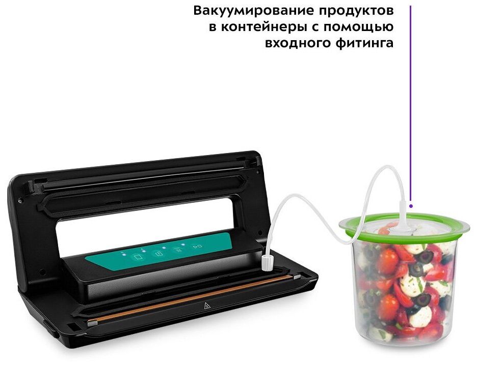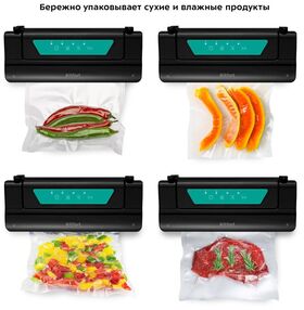 Режимы для вакуумирования сухих и влажных продуктов. Встроенный резак. Шнур для откачки воздуха из контейнеров. Максимальная ширина пакета для вакуумирования - 28 см.Электропитание