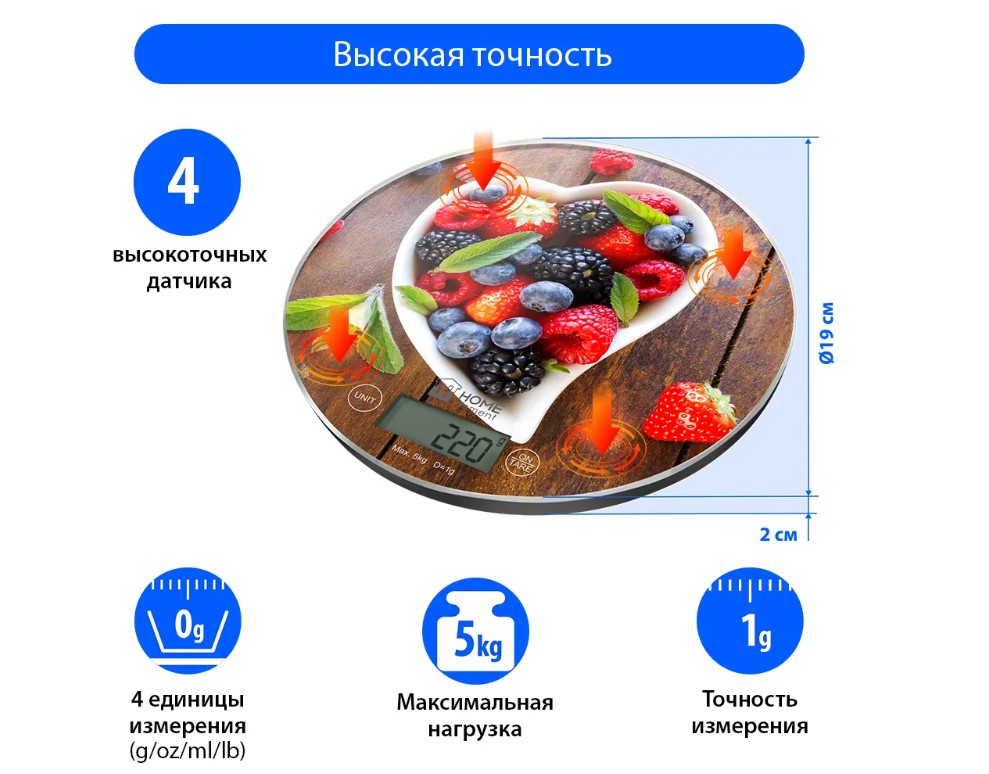 Весы обеспечивают надежное взвешивание продуктов массой до 5 килограммов с точностью до 1 грамма и способны работать в различных единицах измерения (граммы, килограммы, унции, фунты, миллилитры).Функция «ТАРА» позволяет не учитывать массу посуды при взвешивании продуктов, а индикаторы перегрузки и замены батареи сделают работу весов бесперебойной в течение длительного времени.