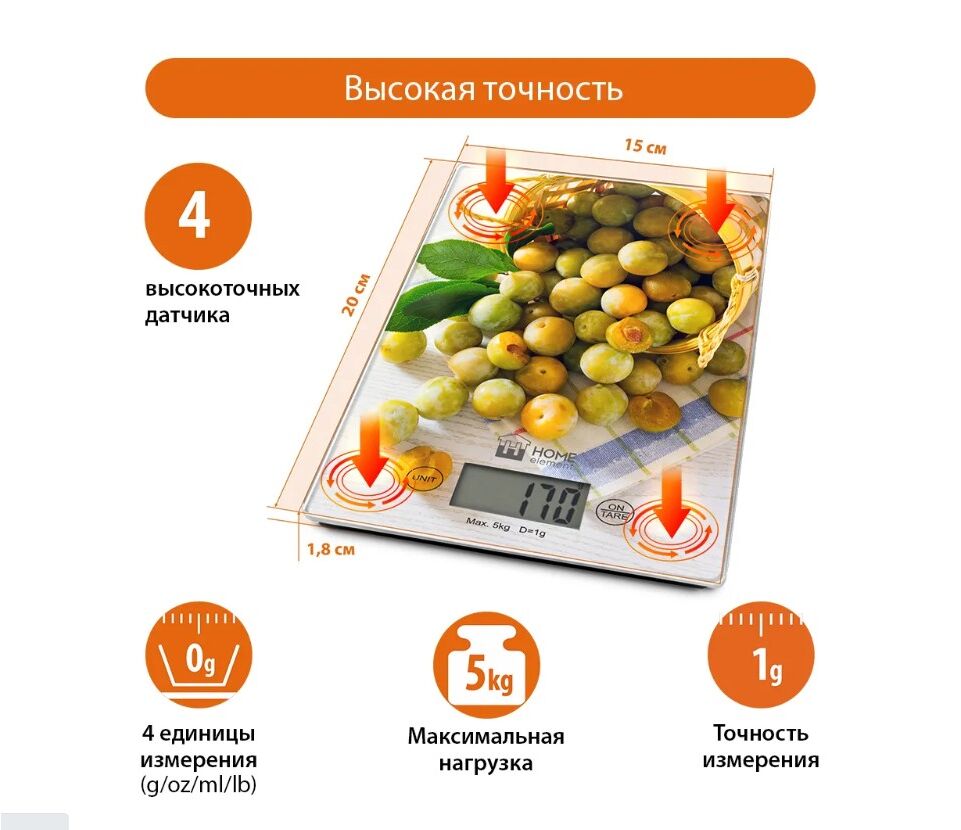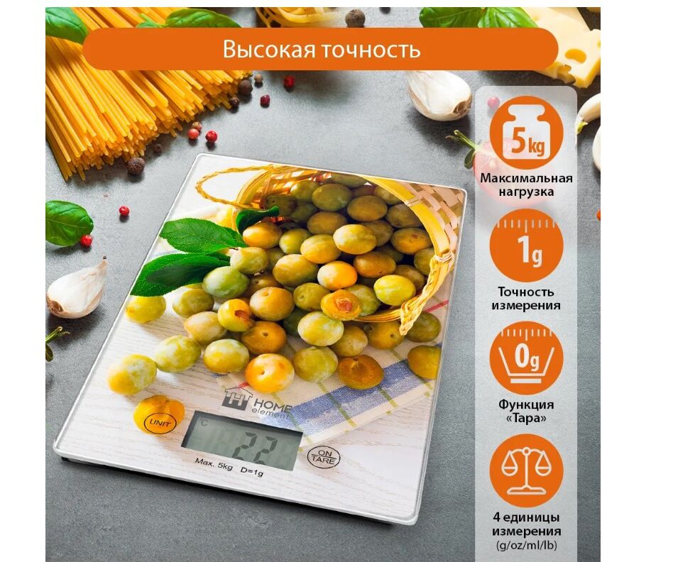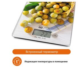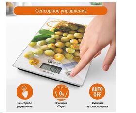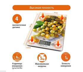 Яркие кухонные весы с красивой и прочной поверхностью из закаленного стекла, большим жидкокристаллическим дисплеем, функцией «ТАРА» и индикатором температуры помещения. Весы обеспечивают надежное взвешивание продуктов массой до 5 килограммов с точностью до 1 грамма и способны работать в различных единицах измерения (граммы, килограммы, унции, фунты, миллилитры). Функция «ТАРА» позволяет не учитывать массу посуды при взвешивании продуктов, а индикаторы перегрузки и замены батарейки сделают работу весов бесперебойной в течение длительного времени. Для экономии заряда литиевой батарейки (входящей в комплект поставки) весы отключаются автоматически, если не используются. Кухонные весы – отличный помощник для тех, кто любит готовить точно по рецептам.