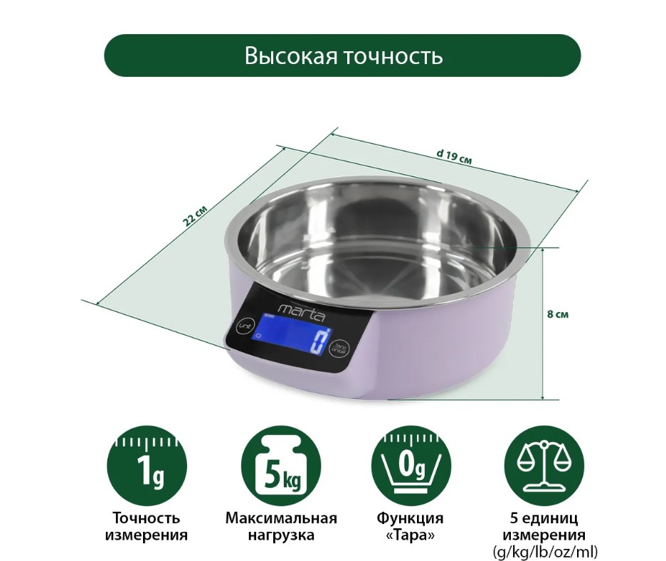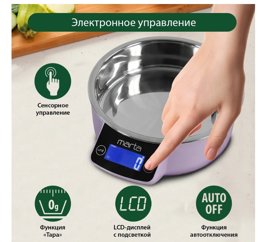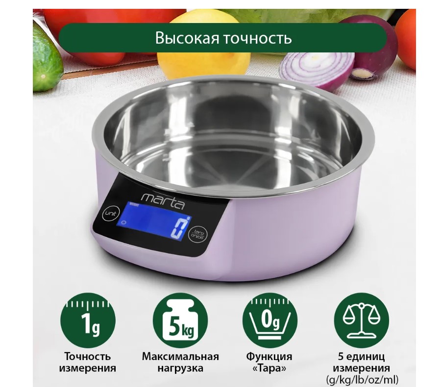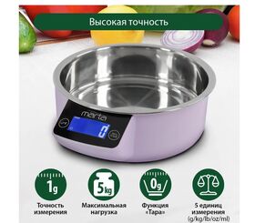 Кухонные весы с металлической чашей и ЖК дисплеем с подсветкой. Обеспечивают надежное взвешивание продуктов массой до 5 килограммов с точностью до 1 грамма и способны работать в различных единицах измерения. Функция «ТАРА» позволяет производить последовательное взвешивание продуктов, а индикаторы перегрузки и замены батареи сделают работу весов бесперебойной в течение длительного времени. Кухонные весы MT-1647 – отличный помощник для тех, кто любит готовить точно по рецептам.