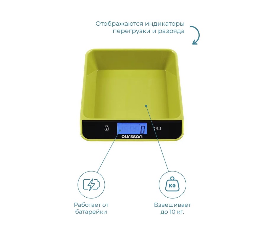 Кухонные весы Oursson KS0507PD помогут быстро и максимально точно (до 1 г) отмерять нужное количество ингредиентов. Вы сможете соблюсти все тонкости даже самых сложных рецептов. Прибор позволяет взвешивать продукты массой до 10 кг. Смело создавайте повседневные блюда и делайте объёмные заготовки на зиму – проблем с расчётами не возникнет. Питание весы получают от двух батареек типа ААА. Это довольно распространённые элементы питания – приобретение новых на замену трудностей не вызовет. Эта модель оснащена ЖК-дисплеем, на котором, помимо показаний, отображаются индикаторы перегрузки и разряда.