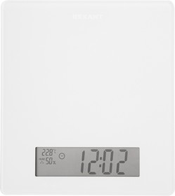 Весы кухонные электронные. Платформа из закаленного стекла с сенсорными кнопками управления. Большой LCD дисплей 141×41 мм. Функции: часы/таймер/температура и влажность окружающей среды. Точность измерения 1 грамм, максимальный груз 5 кг. Питание от 4 батареек тип AAA.