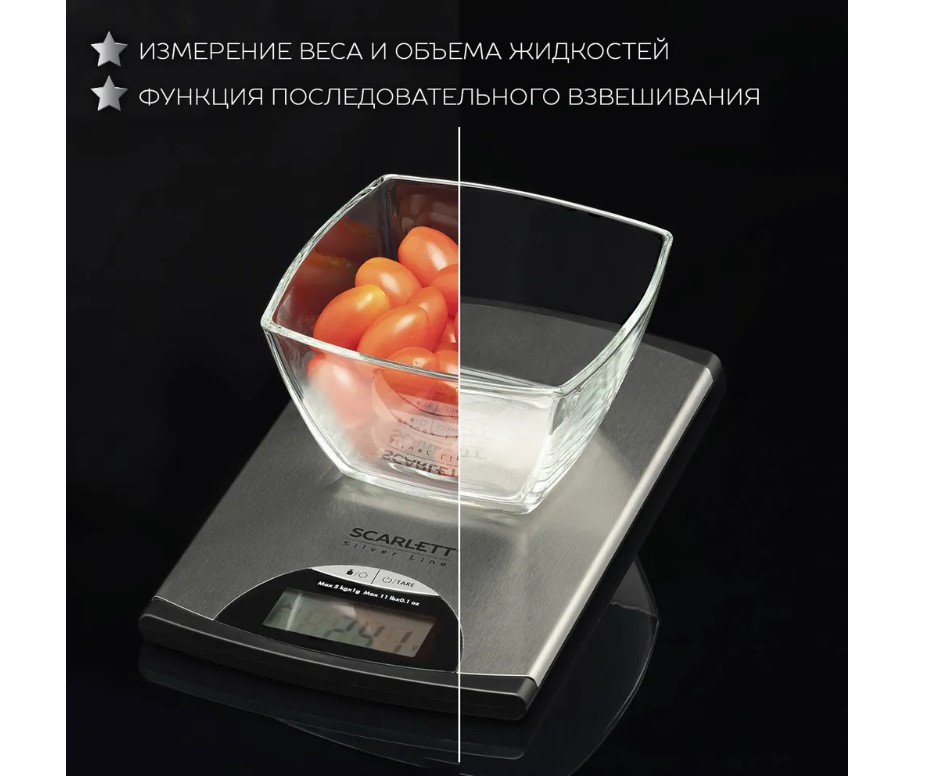 Весы могут измерять не только вес продуктов, но и объём воды или молока – для выбора этого режима достаточно нажать кнопку над дисплеем.