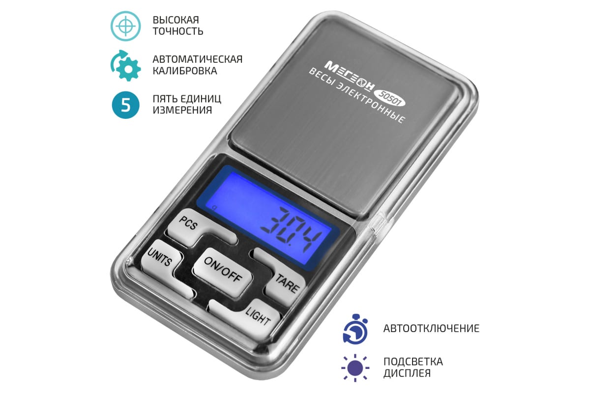 МЕГЕОН 50501 - новинка в модельном ряду бытовых электронных весов с диапазоном измерения 0,01 ... 500 грамм. Модель имеет компактные размеры и маленький вес, позволяющие переносить весы в кармане брюк. Благодаря функции автотестирования после включения и пяти единицам измерения достигается максимальное удобство в эксплуатации, а также применение их в большом количестве сфер деятельности человека от производства до домашнего использования. При помощи режима расчёта количества упрощается фасовка различной мелкой сыпучей продукции, например: бисера. Высокое качество комплектующих обеспечивает низкие показатели базовой погрешности при взвешивании. Наличие интегрированной подсветки ЖК- дисплея гарантирует устойчивое чтение полученных значений даже в условиях недостаточной видимости. Прибор по достоинству оценят профессионалы и любители.