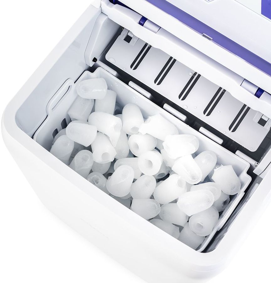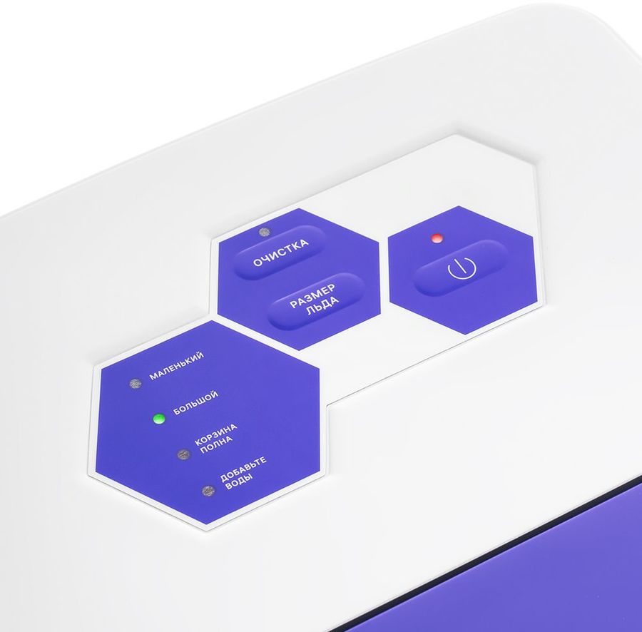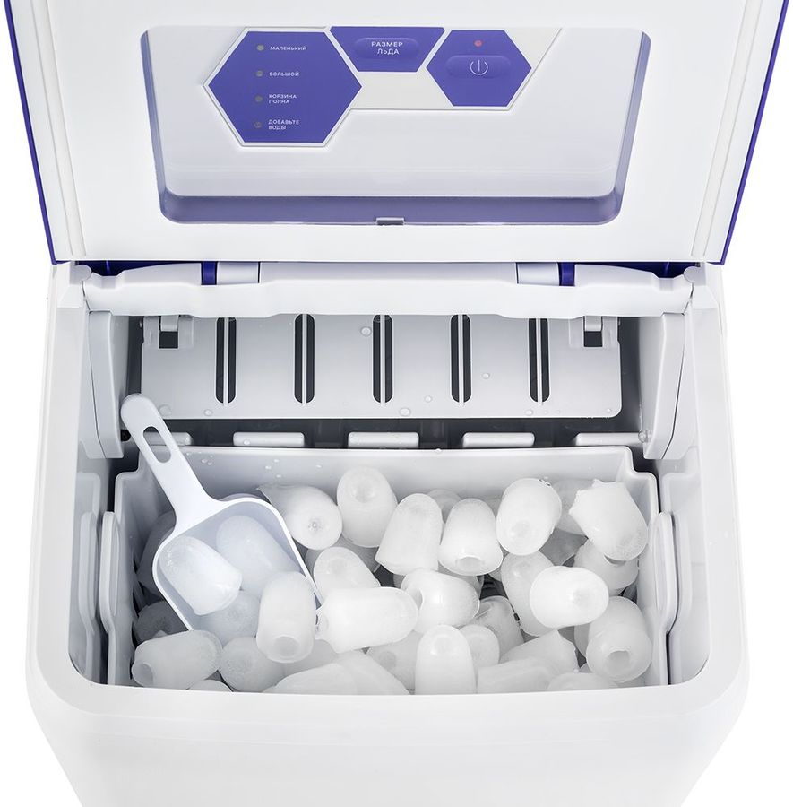 Благодаря инфракрасному датчику заполнения корзины, при её переполнении генерация льда автоматически прекращается. В случае, если лёд достали, льдогенератор запускает цикл заново, пока корзина не будет заполнена. В комплекте идёт совок для черпания льда.