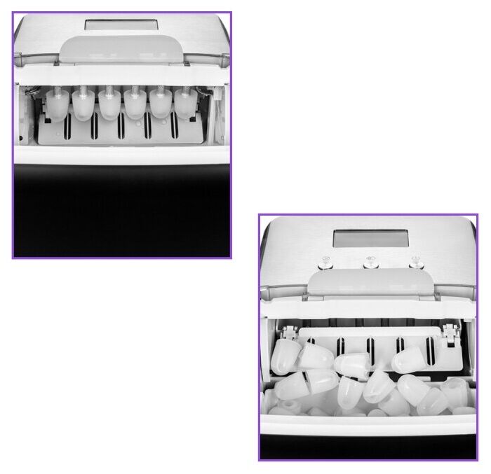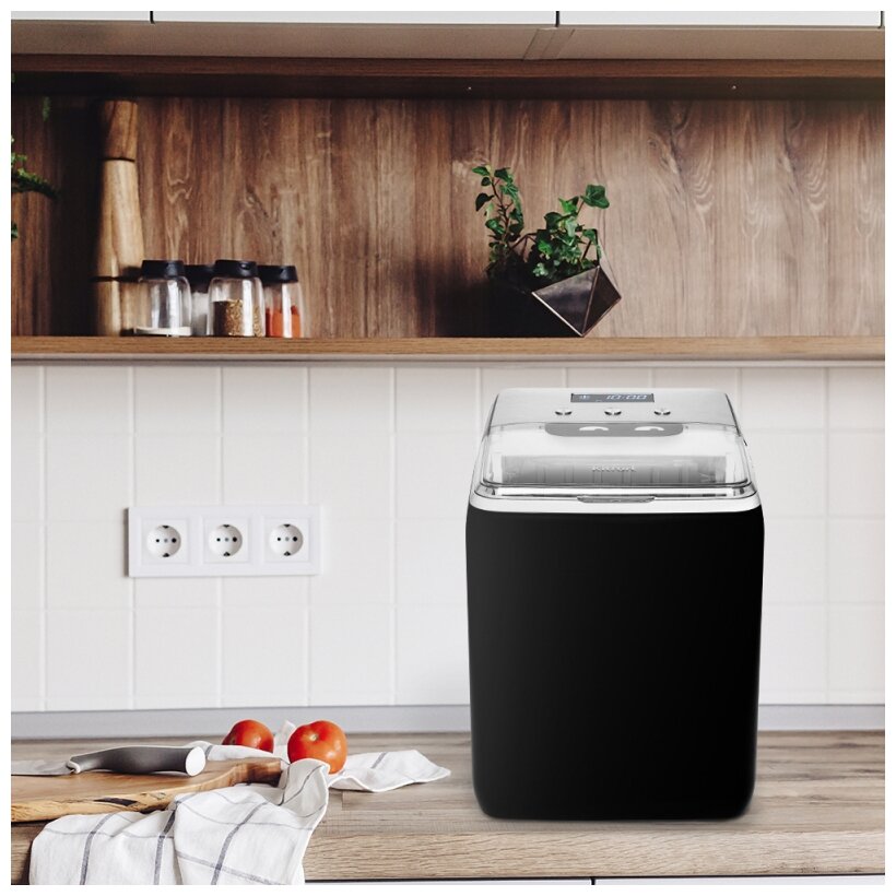 Из-за оригинальной технологии приготовления лёд получается в виде напёрстков. Толщина у них небольшая, поэтому лёд легко измельчается блендером. Благодаря инфракрасному датчику заполнения корзины, при её переполнении генерация льда автоматически прекращается.Электропитание