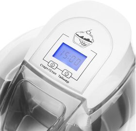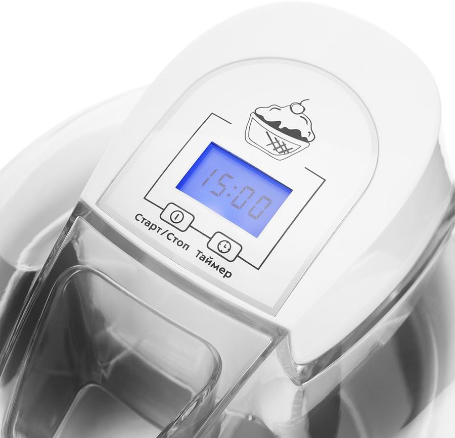 На панели управления вы можете выбрать время приготовления с помощью таймера на 45 минут. Конструкция мороженицы полностью разборная. Её легко мыть и собирать.