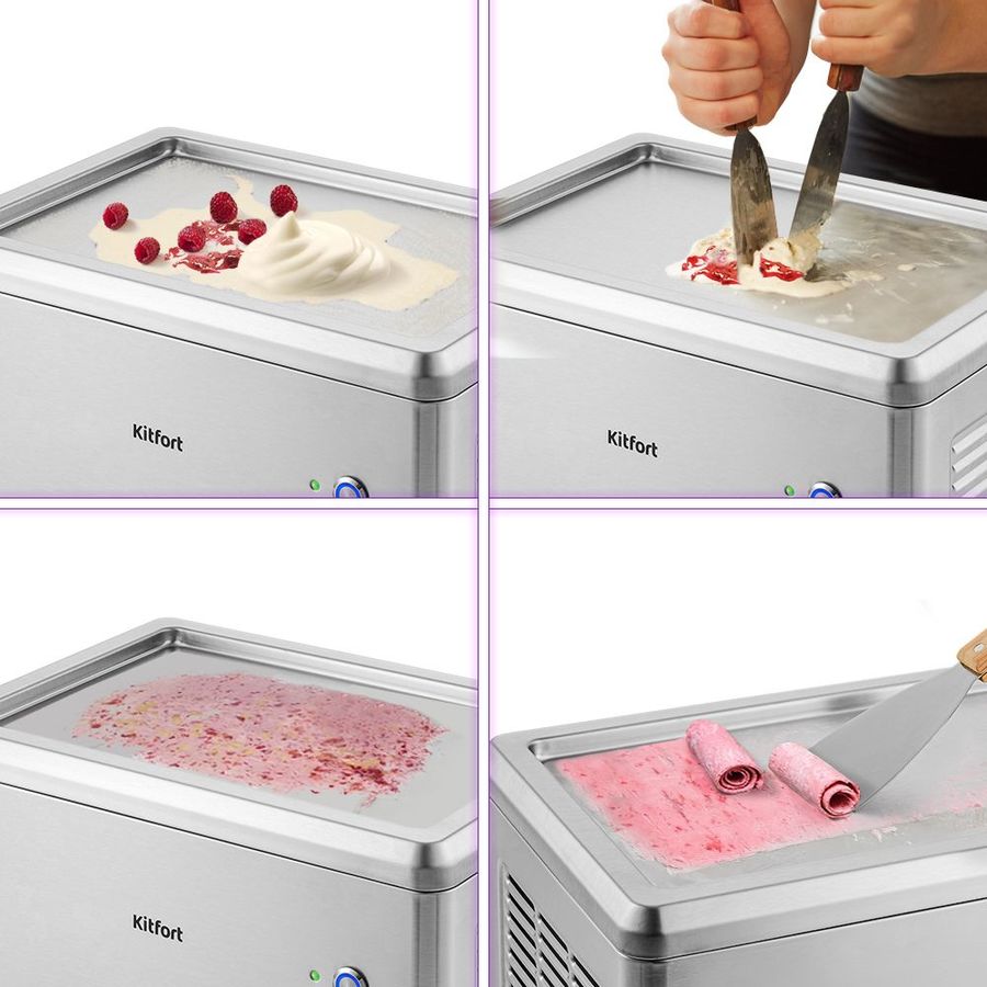 После включения металлическая поверхность мороженицы становится холодной уже через 8-10 минут. На ней удобно распределять смесь, промораживать её и соскребать. Бортики не позволят вытечь смеси или упасть твёрдым ингредиентам.